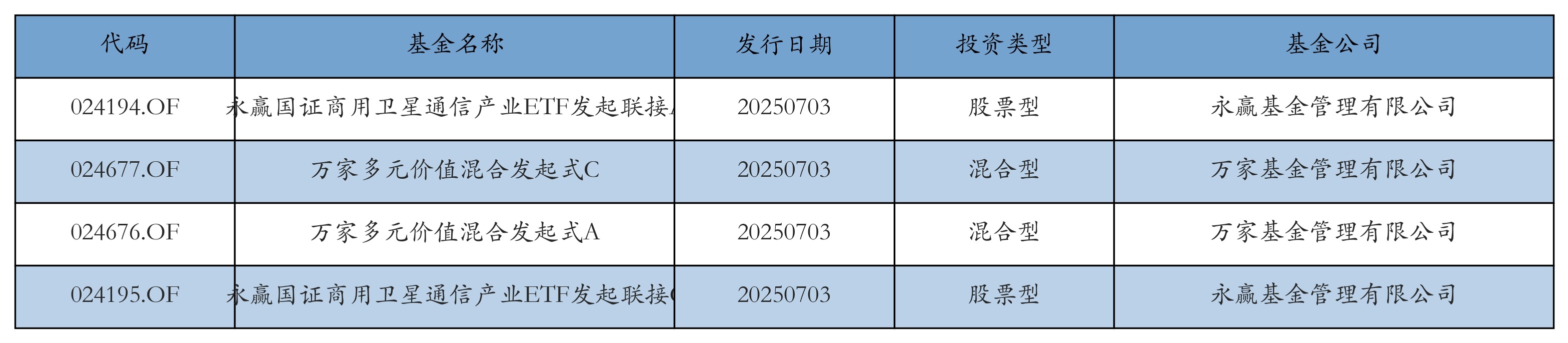 昨日有4只新基金发行,分别为:永赢国证商用卫星通信产业ETF发起联接A、万家多元价值混合发起式C、万家多元价值混合发起式A、永赢国证商用卫星通信产业ETF发起联接C,详情见下表: