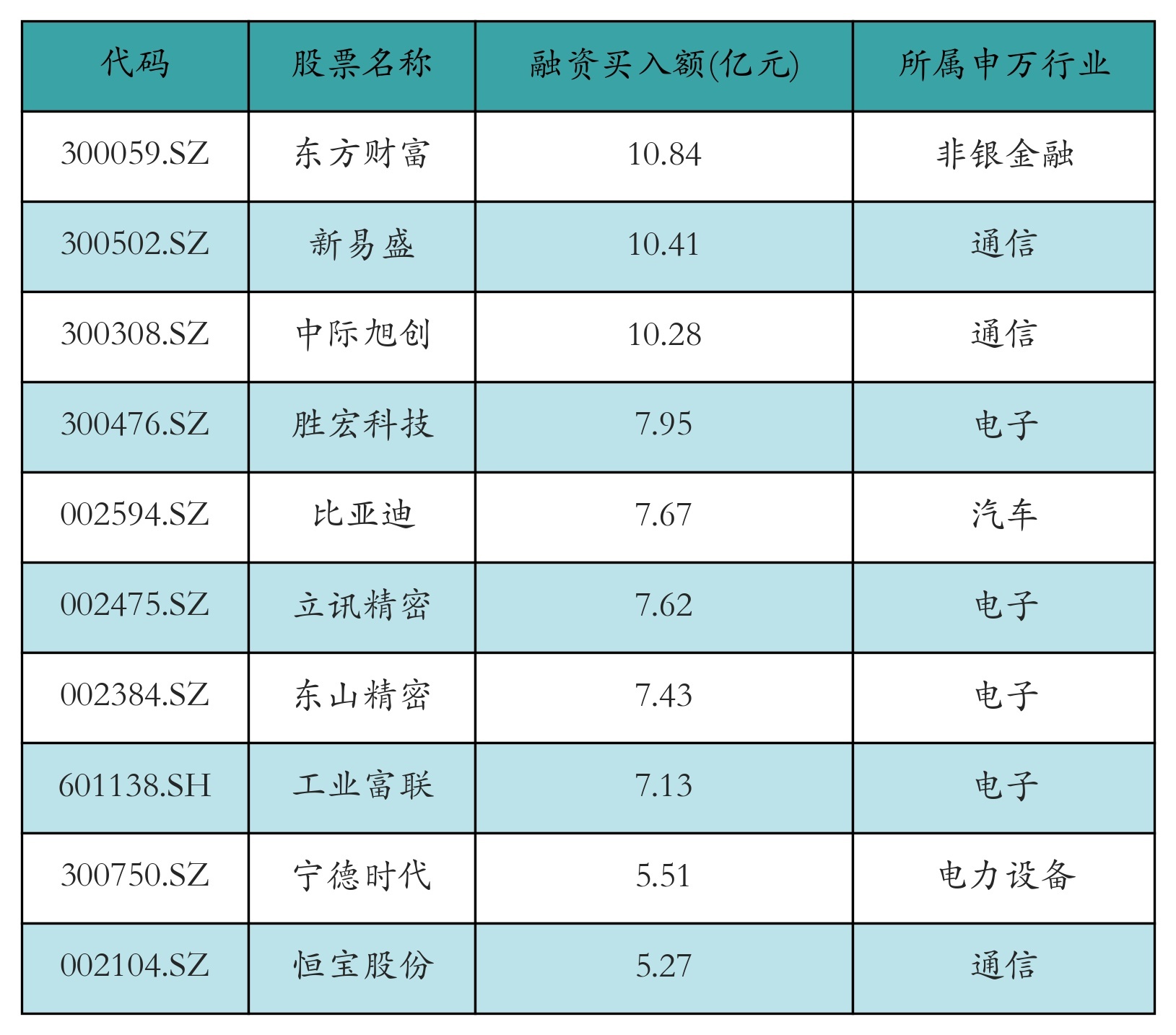 两市共有3408只个股有融资资金买入,其中东方财富、新易盛、中际旭创排名前三,买入金额分别10.84亿元、10.41亿元、10.28亿元。融资买入额前10个股详情见下表: